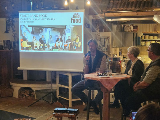 Ausgehend von der Prämisse, dass sich Naturschutz und der Erhalt der Kulturlandschaft nicht ausschließen, sondern einander ergänzen, wurden Antworten gesucht auf Fragen zur Landschaftspflege, zum Tierwohl, zur Regionalen Vermarktung hiesiger Produkte und zu Gastronomischen Angeboten. Weitere Themen waren die Bedingungen der alpinen Landwirtschaft heute unter den klimatischen Veränderungen, unterschiedliche Positionen der Akteure in der Forstwirtschaft und beim Thema Jagd. Rückblicke und Ausblicke ergänzten die Sicht auf die gegenwärtige „bäuerliche Lebensform“ im Priental. Der Aspekt der Zukunftsvisionen nahm einen großen Teil des Gesprächs ein. Denn: Man kann es sich wünschen, dass die heutigen privilegierten Verhältnisse im regenreichen Priental erhalten bleiben. Eine Garantie darauf für alle Zeiten gibt es nicht.